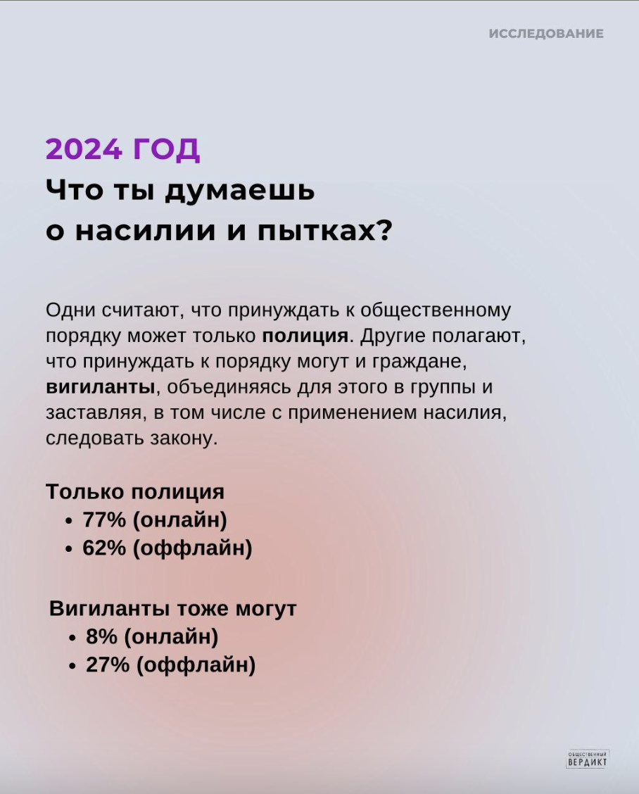 Каждую волну мы что-то добавляем к основному блоку, который не меняется. В этом году мы спросили про применение “умеренного физического воздействия” по отношению к тем, кого подозревают в терроризме. И увидели, что 69% опрошенных онлайн и 32 % по телефонам ответили, что не согласны к применению физического воздействия при допросах подозреваемых в терроризме.