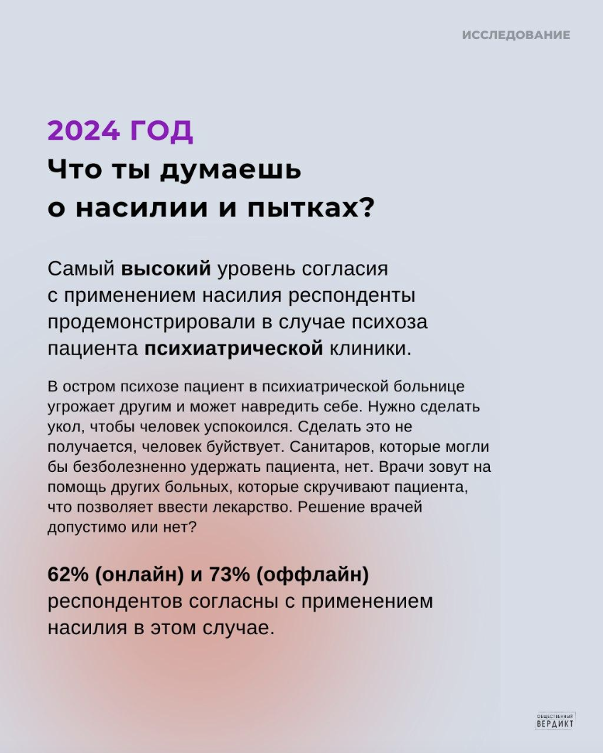 Оно уже меняется. В 2017 году безусловный запрет пыток разделяло 8% респондентов, а сейчас — 12%. Это сдвиг. Есть заметный тренд роста уровня неприятия насилия и пыток. Особенно, это хорошо видно по вопросу об этом грабителе, потому что при самой первой волне считали допустимой эту ситуацию — 43% опрошенных онлайн, а сейчас количество тех, кто согласен с этим, уменьшилось вдвое (17% онлайн респондентов). С пациентом психиатрической больницы — устойчивая доля и по онлайн-опросу, и по телефонному опросу. Психические расстройства внушают людям средневековый страх. Ничего не меняется со времен средневековья, которое очень хорошо описал Мишель Фуко в своих работах. Это какой-то запредельный уровень стереотипизации. Восприятие таких людей как неконтролируемый и непредсказуемый источник угрозы.