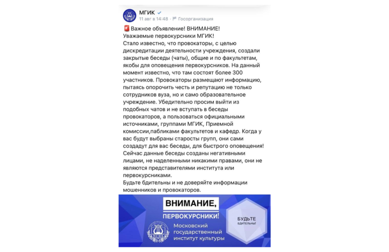 В тот же день в официальных каналах МГИКа появились посты, в которых без имен студентов обвинили в «провокации», а также призвали первокурсников не вступать в беседы или удалиться оттуда. Все возмущенные комментарии к этим постам сотрудники удаляли, а потом и вовсе запретили их комментировать, рассказал Андрей. Позднее пост о «провокаторских беседах» был удален.