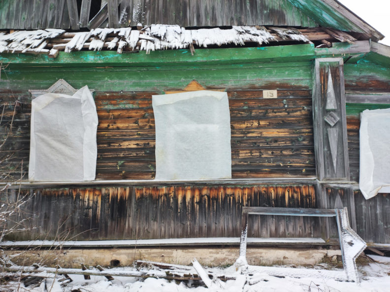 Деревня Заречье, расположенная между Торопцом и арсеналом, в прямом смысле выглядит как после бомбежки. Большинство домов оставлены: окна забиты фанерой, сквозь дырявые крыши светится серое небо. Заборы выглядят так, словно их ударили под дых. На ветру скрипят куски кровельного железа. В большом деревянном доме шесть окон затянуты плотной мутноватой пленкой, сквозь нее доносится стук молотка и бормотание телевизора.