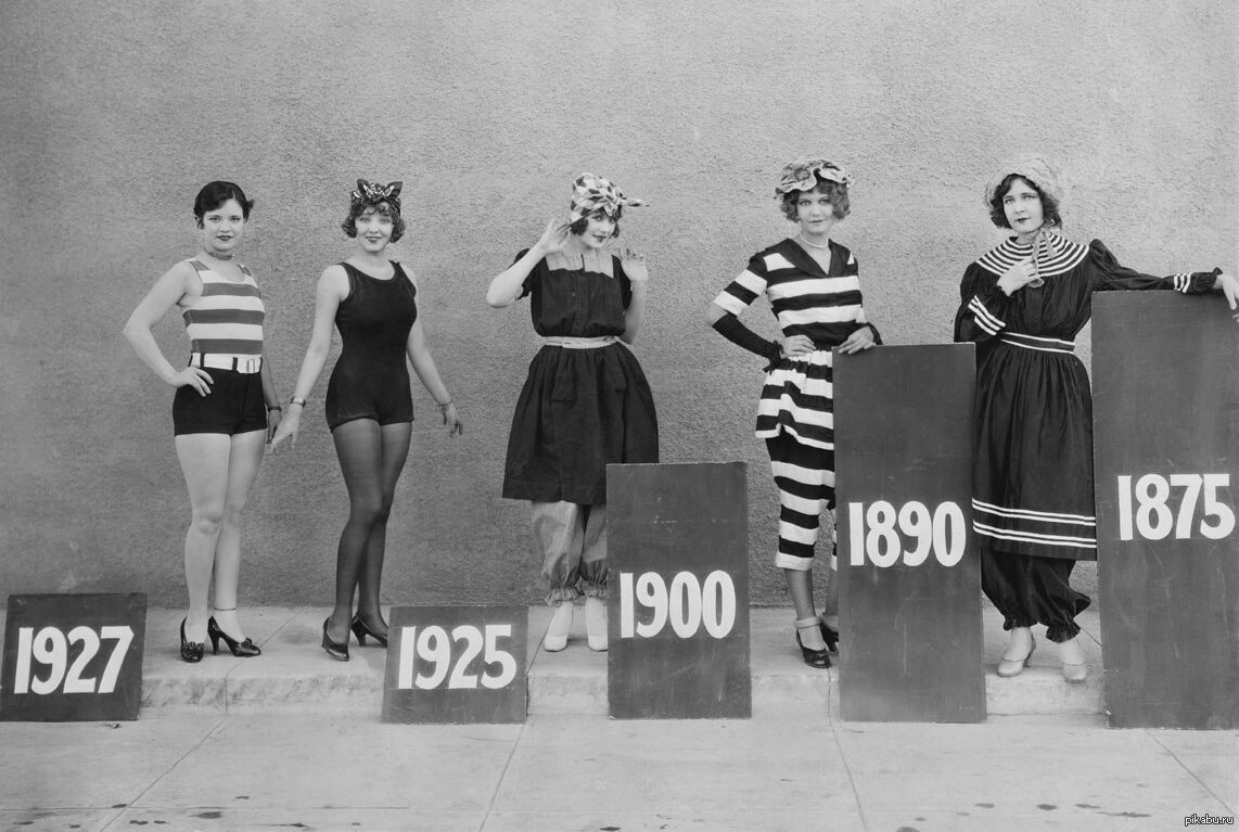Через десятилетие — в 1920-х — женщины уже спокойно носили цельные короткие купальники. Но правила приличия запрещали им открывать ягодицы: нижний край купальника не должен был быть выше 15 сантиметров от колена. Долгое время на пляжах даже работали специальные люди, следившие, чтобы купальный костюм был достаточно приличным: они с линейкой измеряли его длину. За нарушение купальщиц штрафовали и выгоняли с пляжа.