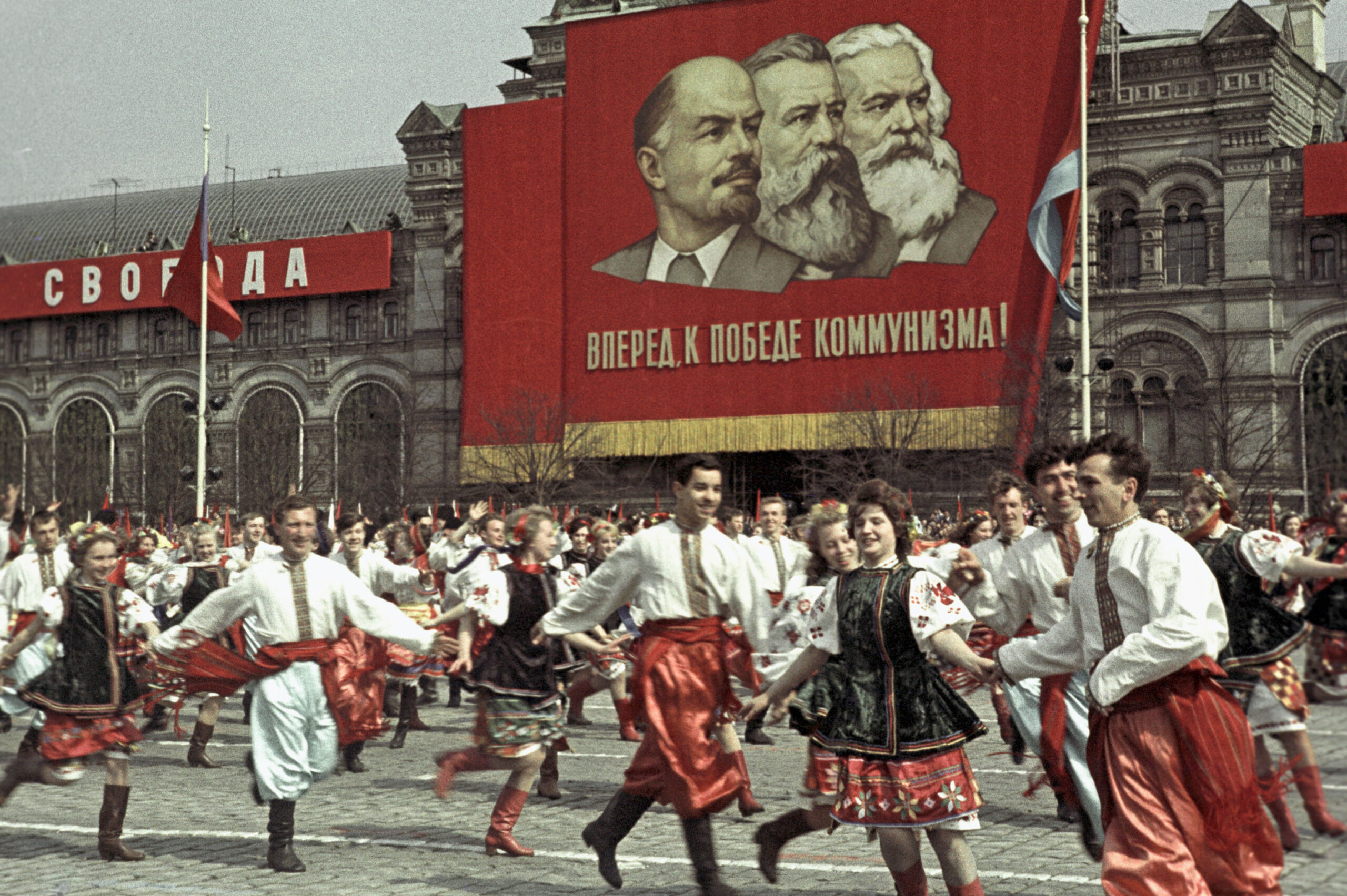 В эпоху оттепели (60-е годы) участвовать в шествии снова весело и важно, но энтузиазм в основном относится не к революционности или государственности, а к весне, молодости, надеждам и радости. А еще, как это ни покажется странным сейчас, — к солидарности с рабочими других стран в борьбе за мир, против всевозможной военщины.